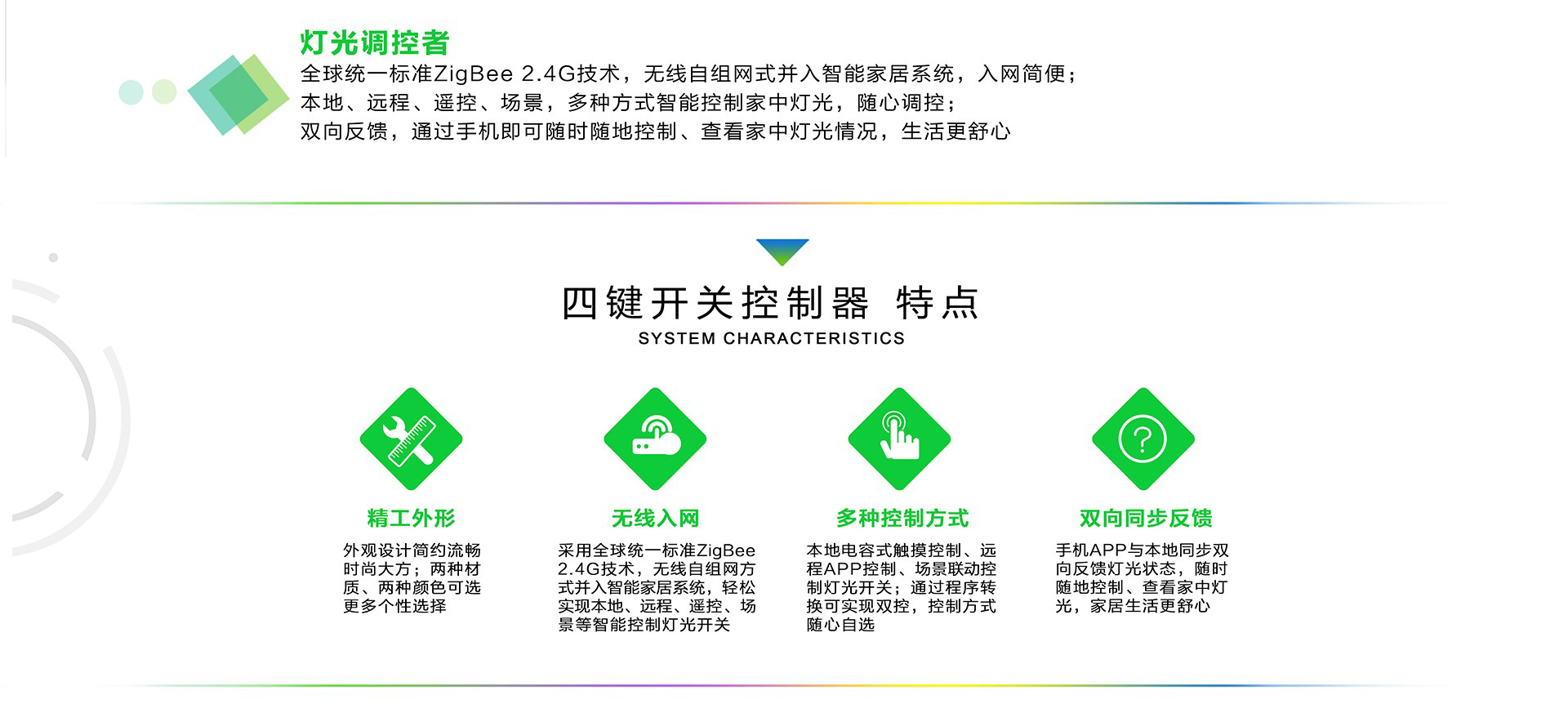 简介:无线开关控制器采用全球统一标准ZigBee 2.4G技术。产品分为单键开关控制器、双键开关控制器、三键开关控制器、四键开关控制器。分别带有1到4个按键控制1到4个灯光回路,可控制灯光开关。并能通过自组网方式并入智能家居网络系统,实现本地、远程、遥控、场景等智能控制,同时还能配置成双控面板。