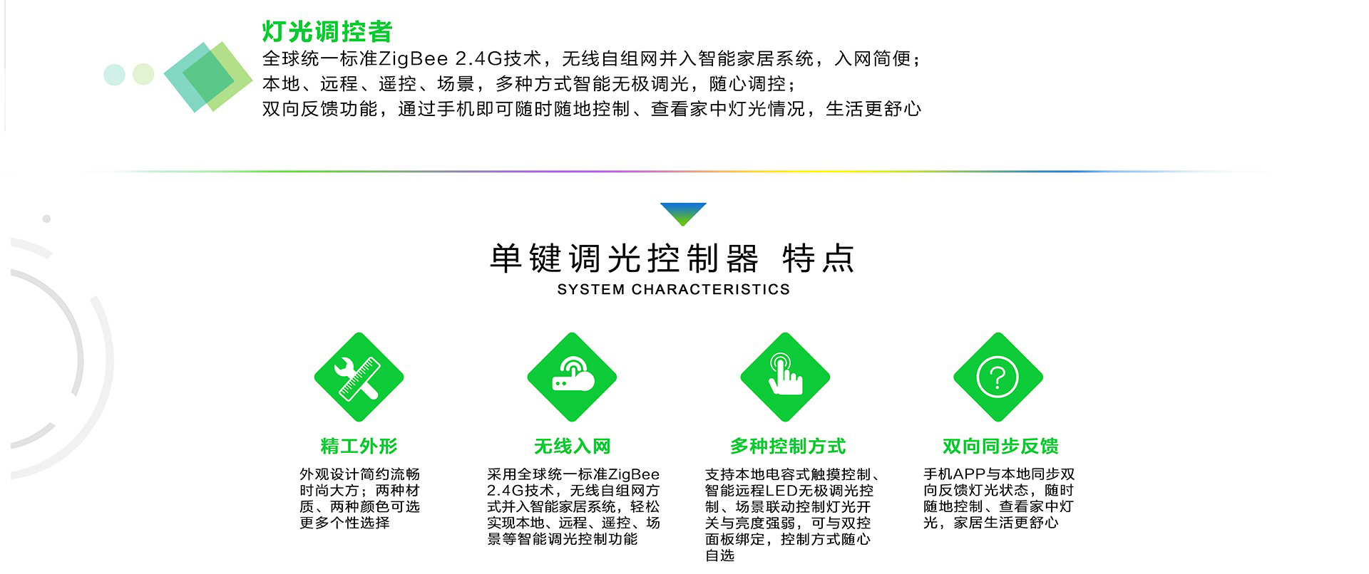 简介:单键调光控制器采用全球统一标准ZigBee 2.4G技术。产品为单键调光控制器,可控制灯的开关及调节灯光亮度。并能通过无线自组网方式进入智能家居网络系统,实现本地。远程、遥控、场景等职能控制。