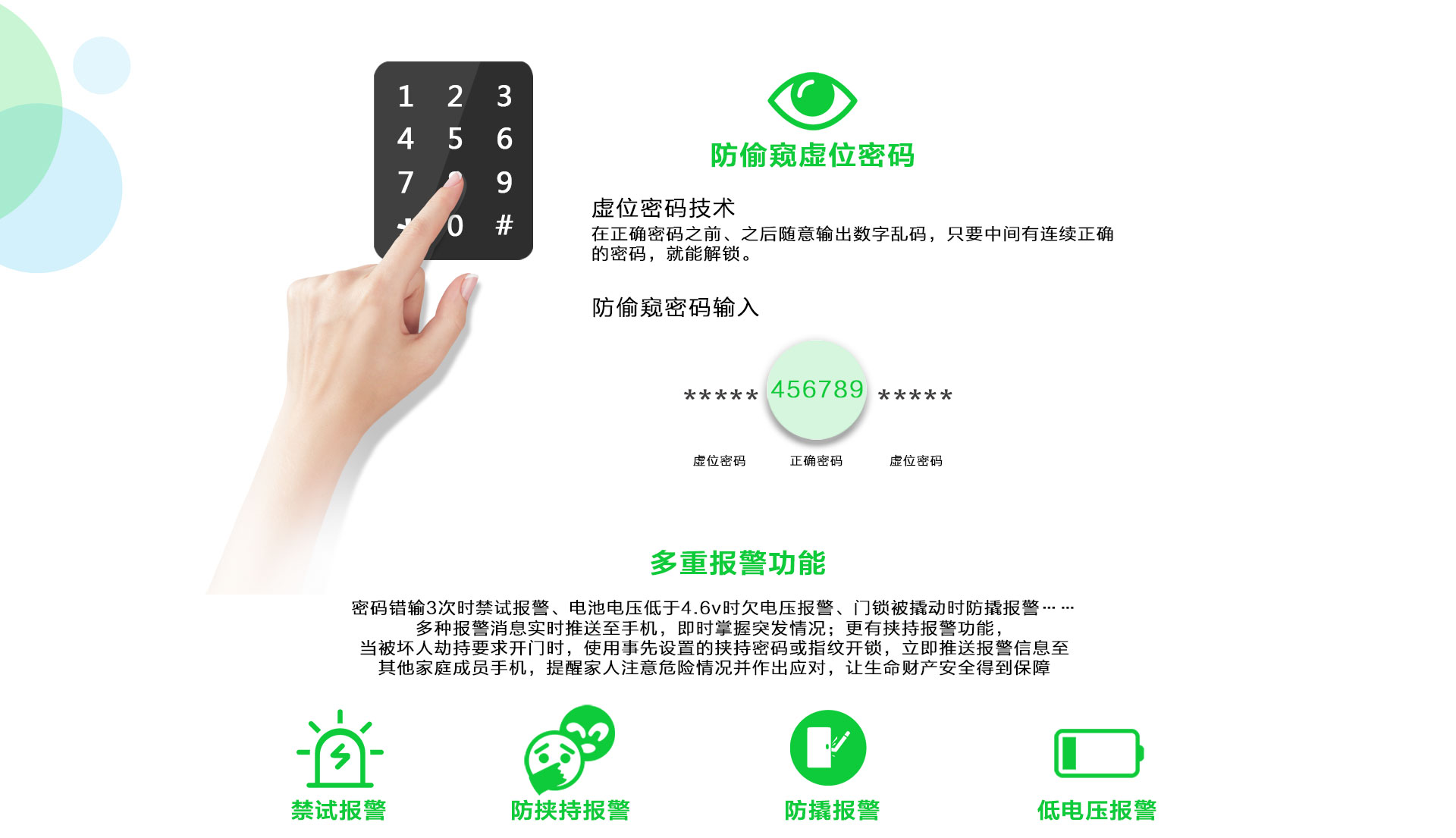 密码防偷窥功能,可任意输入一串密码,只要中间包含6位正确密码即可开门;