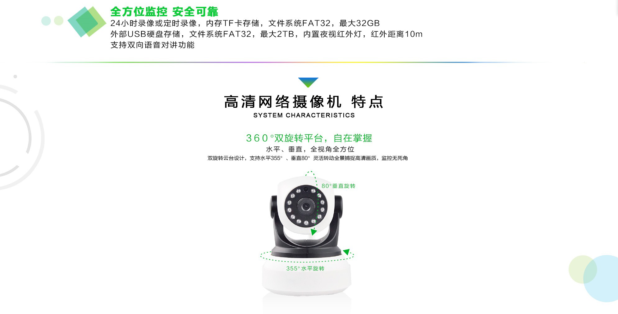简介:高清网络摄像机采用嵌入式Linyx系统,全球通用的ONYIF 2.4协议,功能强大、高性能的可编程媒体海思处理器,内置ARM926@Max. 440MHz和高速视频处理器;1/4英寸1080P逐行扫描CMOS传感器;支持自动白平衡、自动增益控制、自动背光补偿;4.40mm*2.52mm的成像区域;3.6mm镜头;双滤光片自动切换,12颗红外灯,10米夜视距离;支持移动侦测;可以水平350°、上下80°旋转镜头;支持128G TF卡存储和本地存储设备存储;内置-48db麦克风和8Ω1W喇叭实时语音对讲;10Mbps/100Mbps自适应RJ45接口和WiFi802.11b/g/n协议。